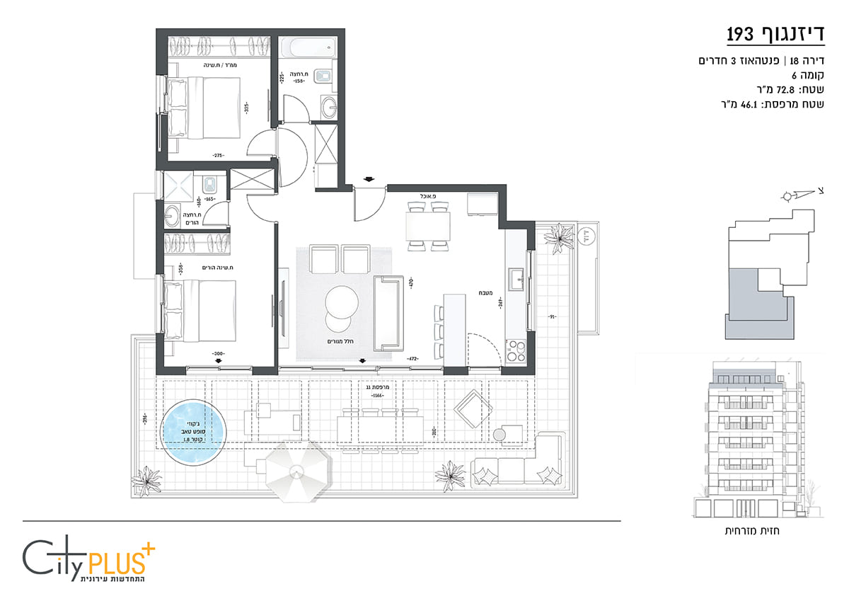 שטח: 72.8 מ״ר + 46.1 מ״ר מרפסת